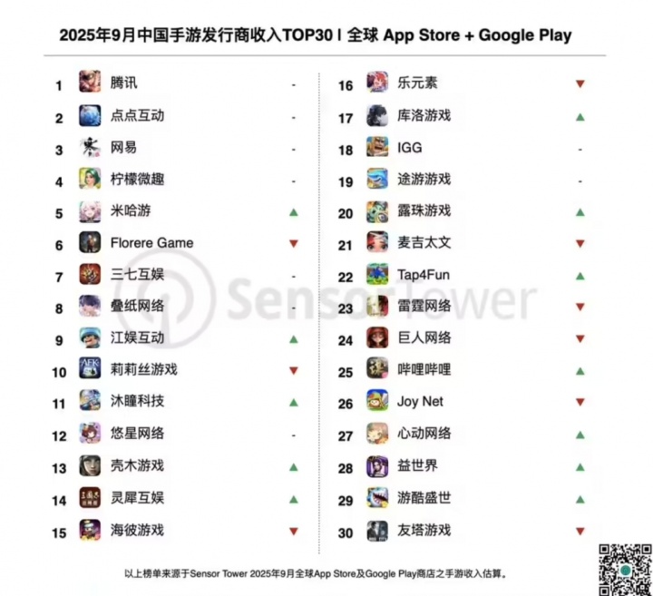 在此期间,中国手游发行商收入的前30名也一一揭晓。腾讯依然表现强劲,其旗下的《王者荣耀》《三角洲行动》《和平精英》以及《金铲铲之战》四款游戏成功包揽了中国App Store手游收入榜的前四名。这些游戏一方面展示了腾讯在市场中的领导地位,另一方面也反映了其游戏在玩家中的广泛受欢迎程度。