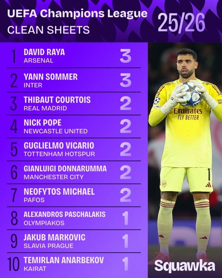 在零封次数方面,阿森纳的拉亚和国际米兰的索默并列榜首,均以3场零封领先其他门将。皇家马德里的库尔图瓦、纽卡斯尔的波普、热刺的维卡里奥、曼城的多纳鲁马以及帕福斯的尼欧菲托斯-迈克尔都取得了2场零封,显示出他们在各自球队中的重要作用。另外,奥林匹亚科斯的柏斯查拉吉斯、布拉格斯拉维亚的马尔科维奇以及阿拉木图凯拉特的阿纳尔别科夫各自贡献了1场零封,虽然场次较少,但同样展示了他们在比赛中的关键时刻。