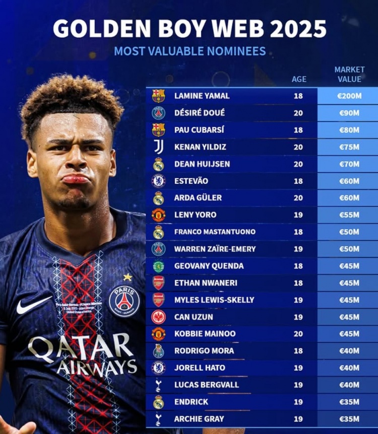 在这个令人期待的十月,金童奖的候选名单如同璀璨星空中的耀眼星辰,终于揭晓。而在这一份名单中,各候选球员的身价也引发了广泛的关注和讨论,尤其是18岁的天才前锋亚马尔,毫无争议地跻身首位,身价高达两亿,显示出他非凡的潜力与未来。