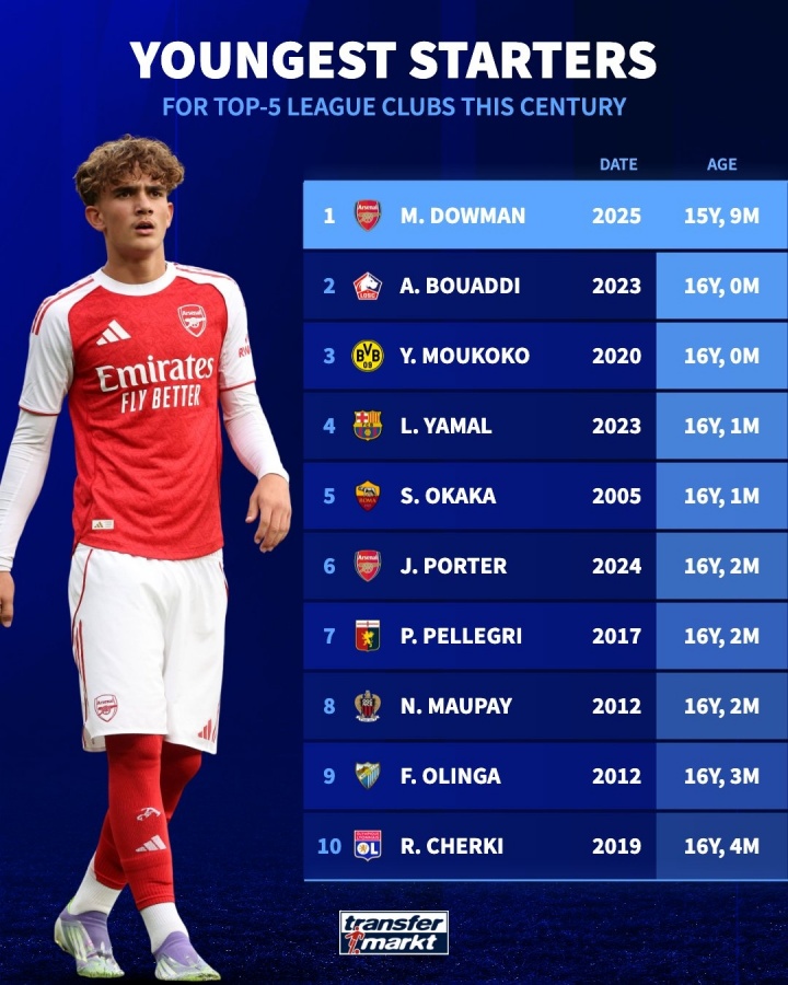 10月30日讯 根据英国转会市场的最新数据,昨晚,马库斯·道曼在英格兰联赛杯中代表阿森纳首发出场,年仅15岁零9个月,创造了本世纪欧洲五大联赛俱乐部最年轻首发球员的记录。这一伟大的成就让道曼成为足球界的焦点,令人对他的未来发展更加期待。
