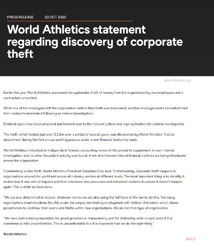据了解,这起盗窃案是在新财务领导团队进行首次年度审计时,由世界田联的财务部门意外发现的。为确保透明和公正,世界田联还特别聘请了一家独立的法务会计机构对这个期间的财务情况进行了深度审查,结果显示并未发现其他欺诈行为。同时,组织方面也表示,将推出一系列加强内部财务控制的措施,以防止类似事件再次发生。