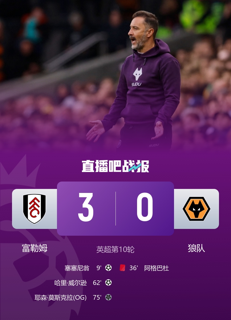 北京时间11月1日晚上23点整,2025-26赛季英超联赛第10轮在克拉文农场球场进行,富勒姆主场迎战狼队。比赛中,富勒姆表现出色,以3-0战胜了少一人的狼队,成功结束了之前的四连败,而狼队则继续以10场不胜的状态位居榜尾。