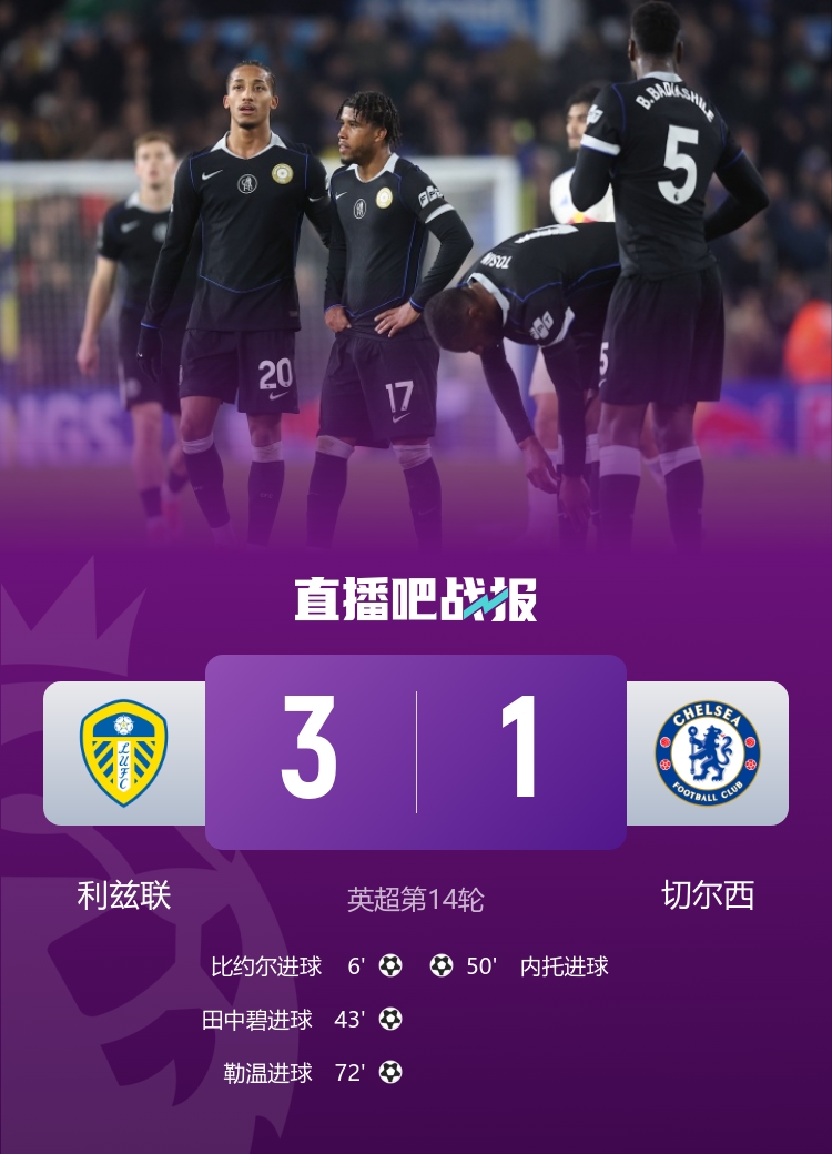 在英超第14轮的较量中,切尔西客场挑战利兹联。比赛于北京时间12月4日凌晨4:15展开,场地设在埃兰路球场。上半场,利兹联先声夺人,比约尔早早利用角球的机会,头球攻门得分,帮助球队取得领先。此后,田中碧中场大力抽射,皮球如同出鞘利剑,直插网底,比分扩大为2-0。切尔西在上半场结束时面临较大压力,未能找到反攻的机会,埃斯特旺在场上也因犯规领到黄牌。