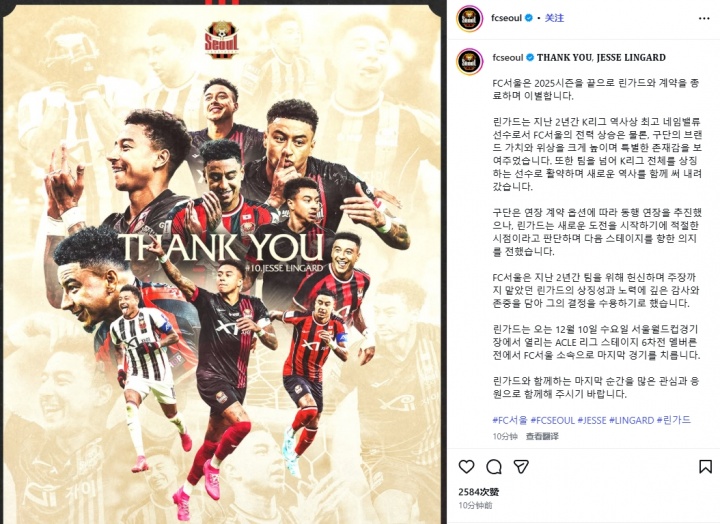 首尔FC日前正式宣布,32岁的进攻球员林加德将在赛季结束后离开球队,结束他与俱乐部的合作。官方公告中指出,林加德与球队的合同将在2025赛季结束时正式终止。