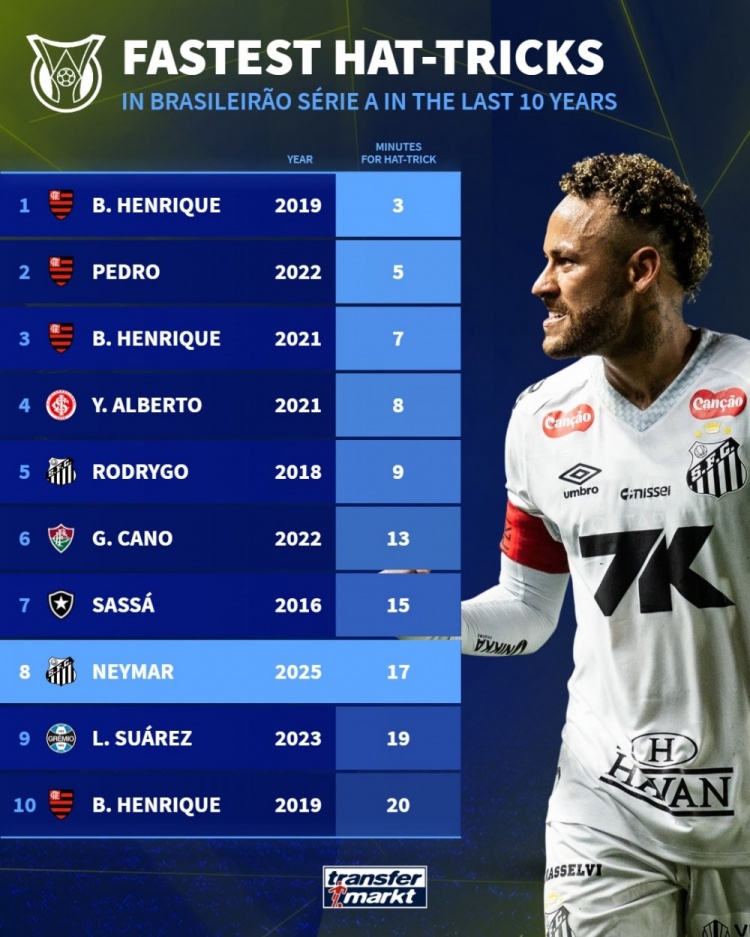 在刚刚结束的巴甲第37轮比赛中,内马尔表现神勇,上演了帽子戏法,帮助桑托斯以3-0战胜尤文图德。根据德国转会市场的统计,内马尔在比赛中仅用17分钟便完成了三次进球,成为巴甲近十年来最快戴帽的球员之一,排名第八。