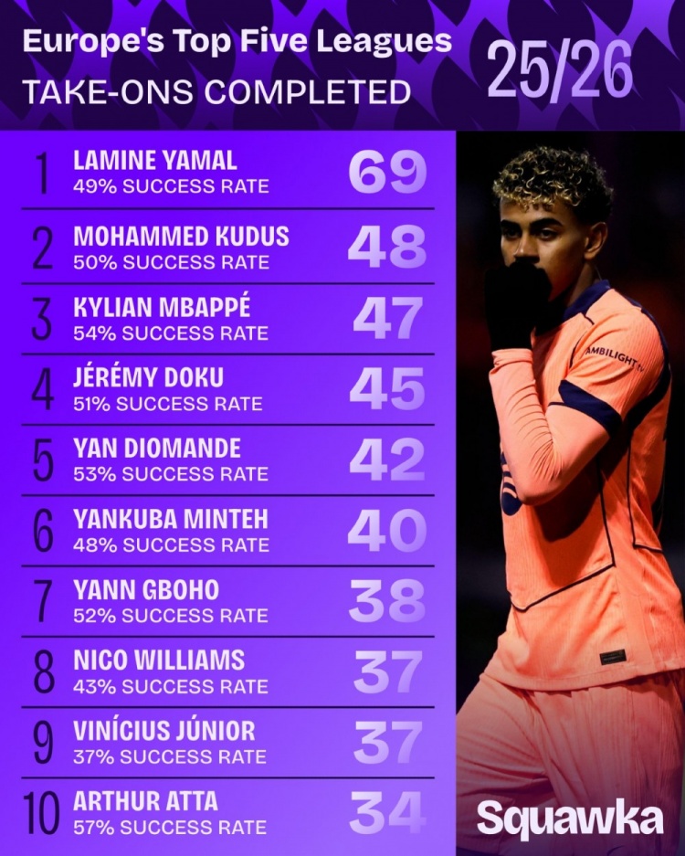 值得一提的是,莱比锡的扬·迪奥曼德和布莱顿的扬库巴·明特,分别以42次和40次的过人数量紧随其后。然而,这些数字对比起亚马尔的69次,简直就是小巫见大巫。