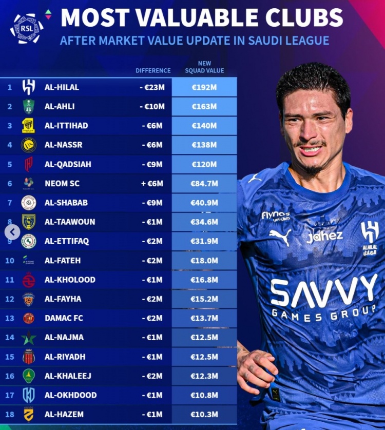 这份身价榜单不仅显示了沙特联赛的竞争态势,也反映了球队在转会市场上的活跃度与投资力度。