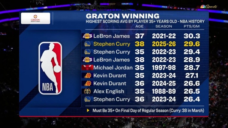 在今日进行的比赛中,勇士队迎战太阳队。与此同时,转播方公布了NBA历史上35岁及以上球员在单赛季中的场均得分排行榜,这份榜单引发了篮球迷的广泛关注。