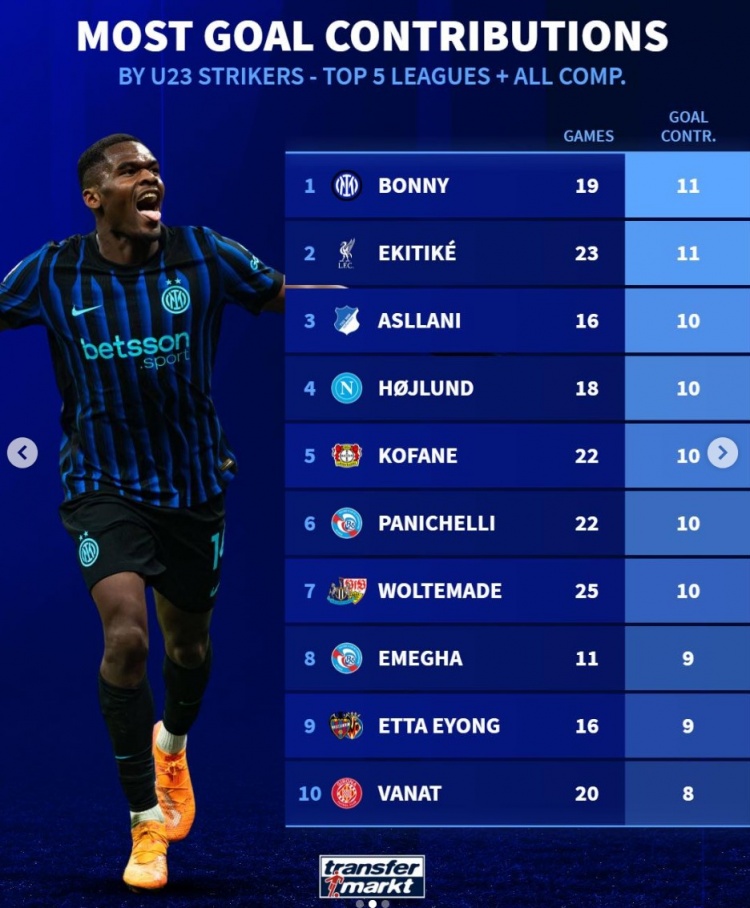 首先,让我们把目光聚焦在国米的博尼,他在19场比赛中打入了11球,毫无疑问,他的表现为球队增添了无限活力与可能。而另一位同样出色的前锋埃基蒂克,效力于利物浦,在23场比赛中同样打入了11球。这样的表现,恰如其分地印证了他在球队中的重要性。