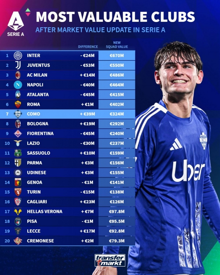 接下来的罗马,身价为4.02亿欧,虽然在历史上曾辉煌一时,但近年来的起伏让球队面临挑战。科莫则以3.24亿欧的身价在人群中占有一席之地,这支球队同样在努力寻找更高的发展空间。