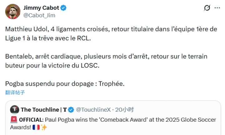 博格巴在12月29日获得了环足奖的最佳复出奖,然而他的这一成就并没有得到所有人的祝福,前法甲球员吉米·卡博特就在社交媒体上对此进行了嘲讽。他指出,尽管博格巴曾因药检阳性事件被禁赛,但其他一些球员的复出故事显然更为感人。