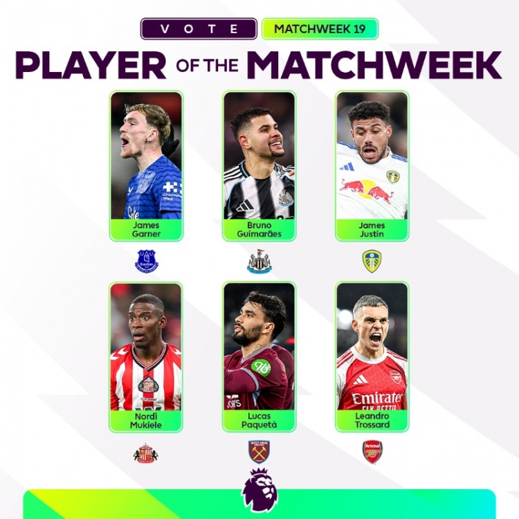 英超官方网站于1月2日发布了第19轮最佳球员候选名单,共有六名球员入围,分别是詹姆斯·加纳、布鲁诺·吉马良斯、詹姆斯·贾斯汀、穆基勒、帕奎塔和特罗萨德。