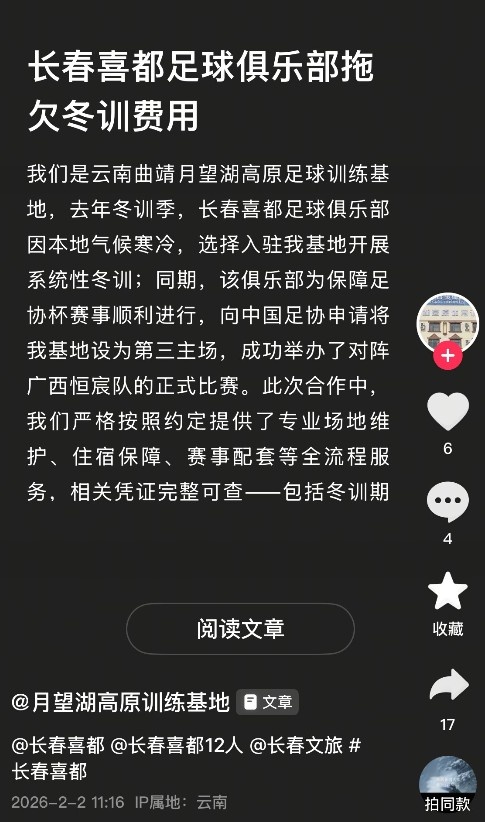 近日,云南曲靖的月望湖高原训练基地在社交媒体上发文,揭露中乙球队长春喜都足球俱乐部未支付去年冬训练习费用一事,欠款总额超过30万元人民币。