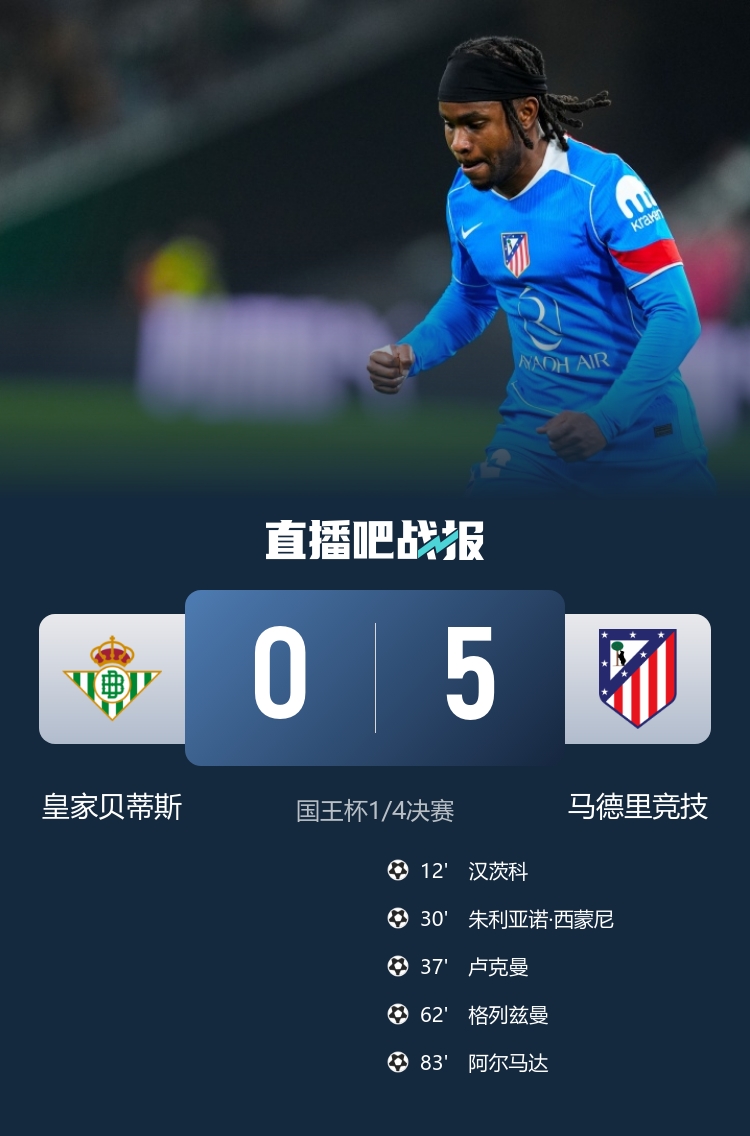 2月6日,国王杯四分之一决赛在贝尼托比利亚马林球场展开,皇家贝蒂斯迎战马德里竞技。比赛上半场,马竞展现了强大的攻击力,汉茨科、小西蒙尼和卢克曼相继打入三球,帮助球队以3-0的优势进入下半场。重新开始后,卢克曼助攻格列兹曼扩展了领先优势,阿尔马达则为马竞在比赛尾声时添上漂亮一笔。最终,马竞以5-0的惊人比分客场战胜贝蒂斯,成功晋级四强。