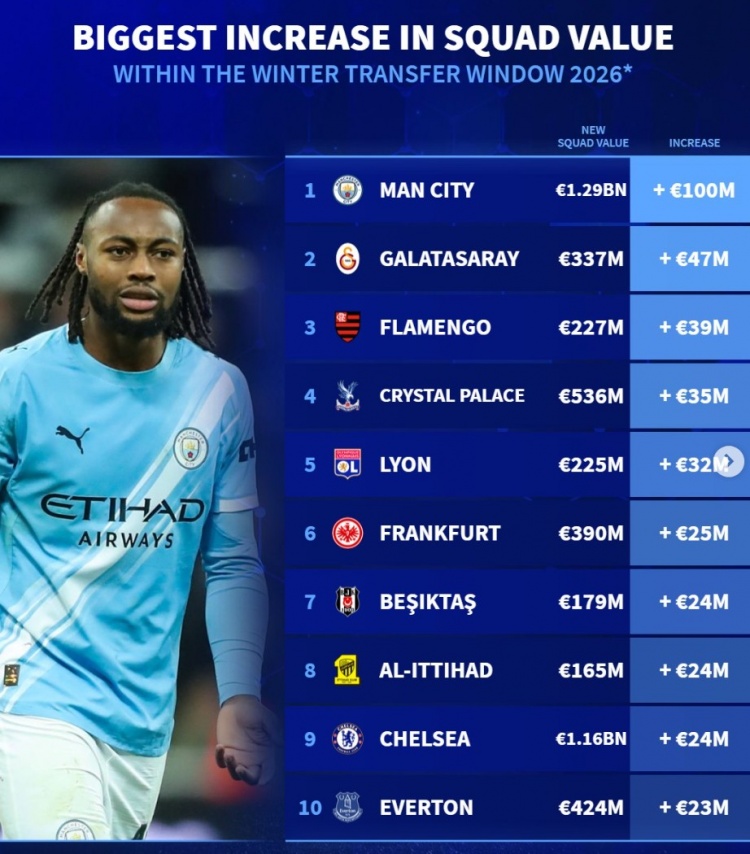 曼城的身价达到了惊人的12.9亿欧元,较前一阶段增加了1亿欧元。这一成就无疑是俱乐部在冬窗期间精准引援的结果。紧随其后的是土耳其豪门加拉塔萨雷,他们的身价上升了4700万欧元,达到3.37亿欧元,展现了他们在引援策略上的成功。