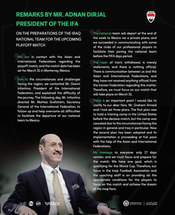 伊拉克足协主席达尔贾尔在3月14日发声,仿佛在进行一场演讲,关乎未来的命运与希望。他表示,国足将坐上私人大飞机,准备在墨西哥进行世预赛附加赛的备战,然而话音未落,关于伊朗退赛的传闻便被他一口否认,声称没收到任何官方通知。这好比在赌场里,做了注,但又希望对手主动放弃,真是美梦一场。