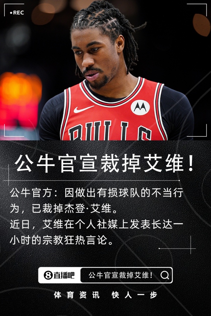 3月31日讯 今日,芝加哥公牛队正式宣布裁掉后卫杰登·艾维。球队在声明中表示:“由于涉及对球队造成损害的不当行为,艾维被解除合同。”