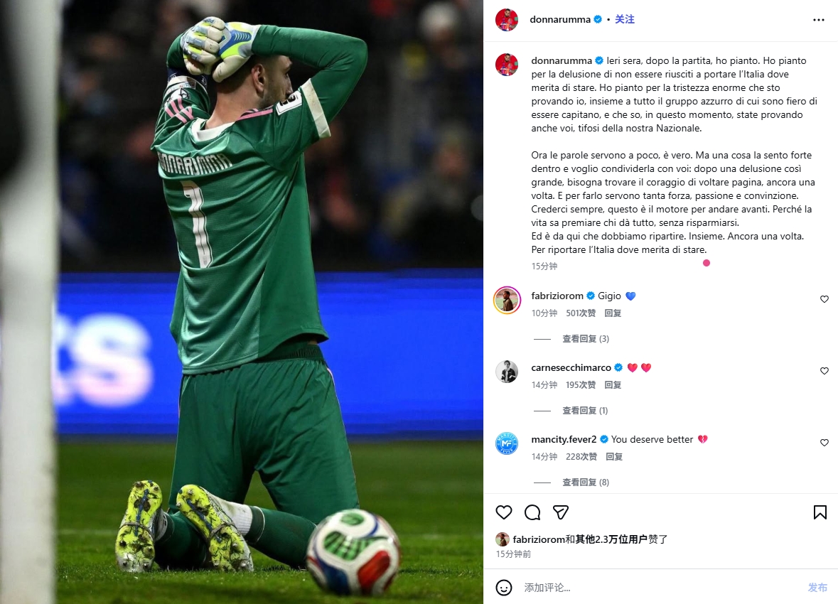 在4月1日的世预赛欧洲区附加赛决赛中,意大利在点球大战中遗憾地不敌波黑,连续三届无缘世界杯。赛后,球队的队长多纳鲁马在社交媒体上分享了他内心深处的感受。