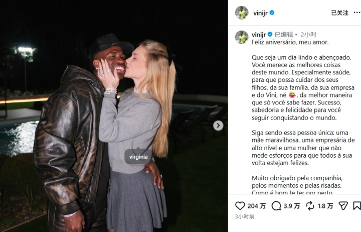今天是维尼修斯的女友维吉尼亚的27岁生日,维尼修斯在社交媒体上为她送上了暖心的祝福,充满了爱意。他在动态中写道:“生日快乐,我亲爱的。希望你度过一个美好而又充满祝福的日子。你值得拥有这个世界上最美好的事物,尤其是健康——这让你可以更好地照顾孩子、家庭、事业,还有我,对吧? ? 愿你在追求世界的过程中,成功、智慧与幸福常伴左右。
