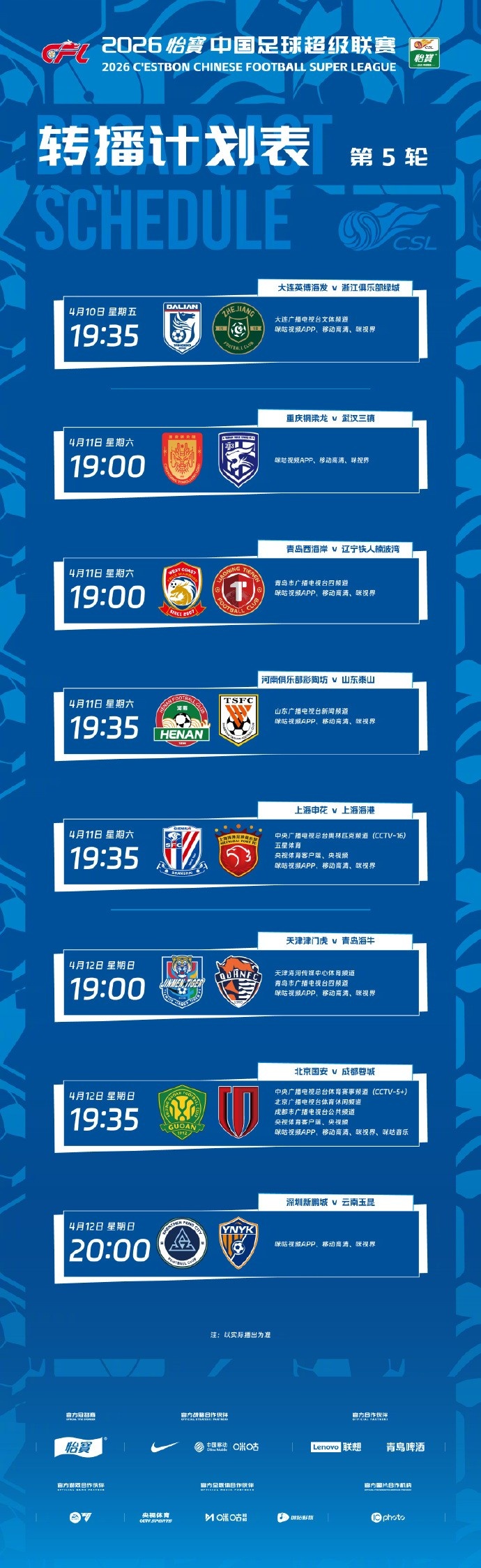而上海德比则将在4月11日19:35进行,中央广播电视总台奥林匹克频道(CCTV-16)以及五星体育等频道将一同为广大球迷呈现这一巅峰对决。