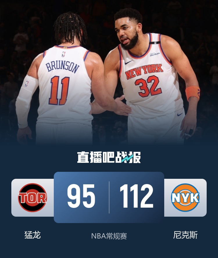 最终,比赛以112-95的比分落幕,尼克斯在主场顺利击退猛龙,继续巩固他们在季后赛中的有利位置。