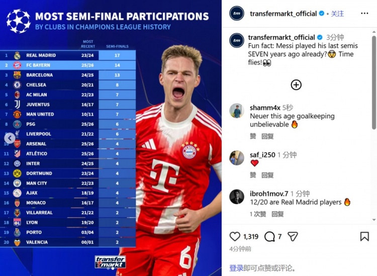 拜仁此次挺进欧冠四强的成就,并非偶然,而是他们在这项赛事中积累的辉煌。在欧洲的历史长河中,这已是他们第十四次闯入欧冠的四强行列,稳稳占据第二的位置,仅逊色于拥有十七次半决赛经历的皇马。王者之师的成绩证明了他们在这片绿茵场的统治力与历史份量。